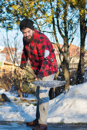 Removal snow from driveway after snowfall. Man using snow shovel on street in winter