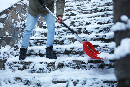 Man cleaning stairs from snow with shovel outdoors on winter day, closeup