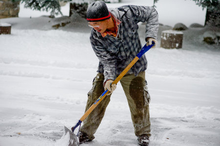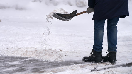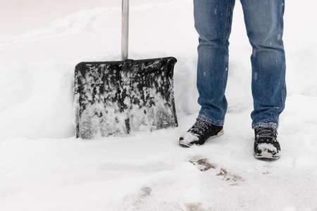 close up of adult cleaning snow from sidewalk and using snow shovel after heavy snowstorm