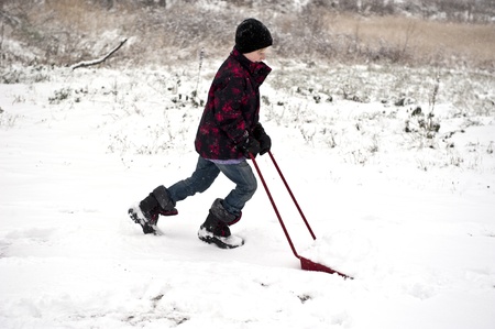 A teenager shoveling snow in his yard. The concept of a snowy winter
