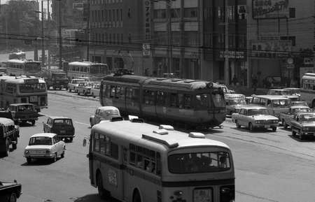 Young asian couple walking in the city. Vintage filter effect.