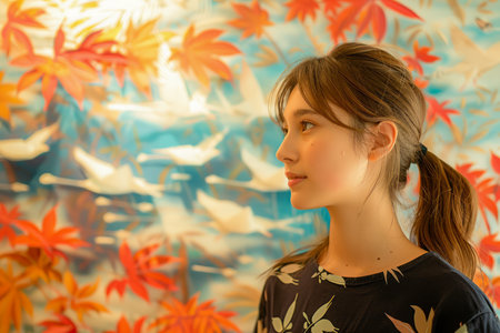 Young Woman Contemplating Autumn Leaves Backdrop in Warm Indoor Light AI Generative