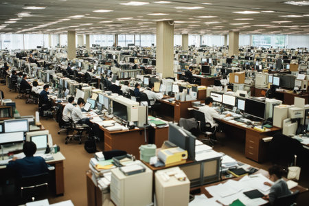 A bustling office filled with numerous employees engaged in various tasks at their desks, surrounded by multiple computer monitors and paperwork in a bright, large environment.