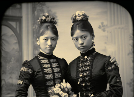 Group of women in 1910, retro vintage photo of multicolored people.