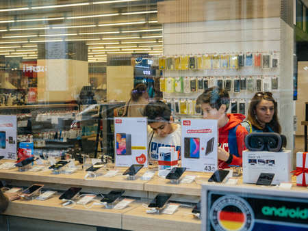 Baku, Azerbaijan - May 3, 2019: View from the street of young boys using electronics technology products inside modern supermarket tech store new smartphones, vr masks, and other products on main Baku avenue