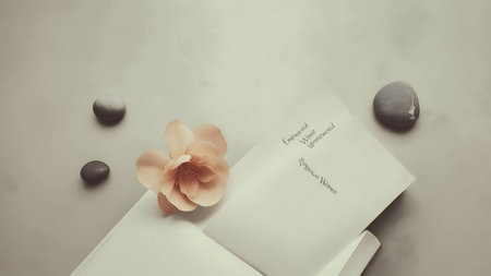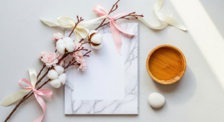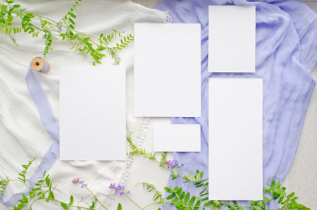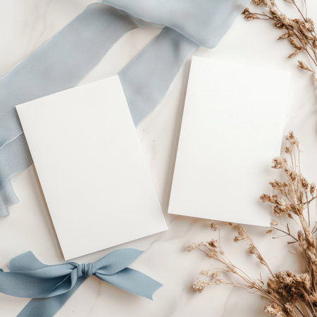 Two blank white wedding cards, with blue ribbon and dried flowers on the side, flat lay photography, minimalist background, soft pastel colors. --v 6.1 Job ID: c83370bb-a1e7-450b-86a2-2ad92d82e408