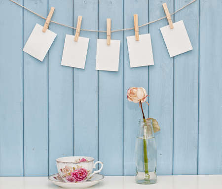 Blank photos hanging on rope with clothespins on blue wooden background, cup of tea and rose