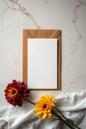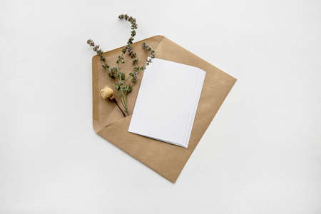 An envelope made of kraft paper, a white blank card and dried flowers on a white table. Fashionable holiday background top view