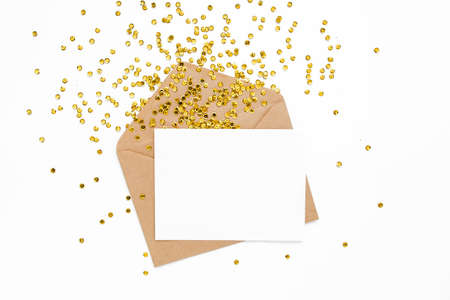 Styled desk with envelope, blank card and golden confetti isolated on a white background. Flat lay. Mockup template. View from above