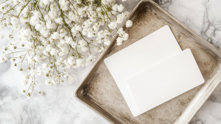 This elegant composition features minimalist white cards placed on a silver tray, surrounded by delicate white flowers, showcasing a serene and artistic vibe perfect for various creative projects.