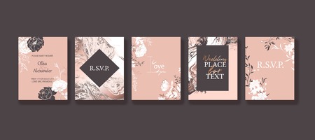 Floral frame design. Wedding invitation arrangement. Hand drawn flowers, roses, leaves. Rose gold marble texture.