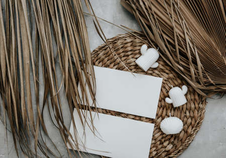 Summer stationery still life with blank paper card and palm leaves on stone background. Minimal boho Mockup invitation.