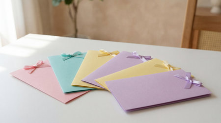 Pastel greeting envelopes with decorative ribbon bows arranged in a neat row on a white desk in soft natural daylight.