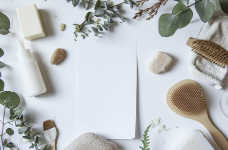 Flat lay of creative interior composition with mock up visit cards, textile, rocks, wood, natural materials, dry plants and personal accessories. Neutral colors, top view, template.
