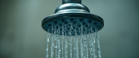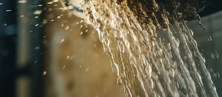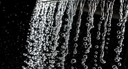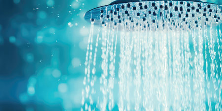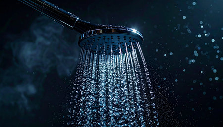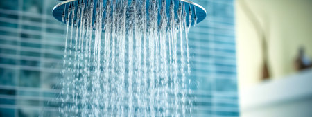 This image showcases water streaming from a sleek showerhead, highlighting glistening droplets in a modern bathroom. It conveys cleanliness and relaxation.