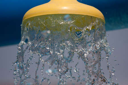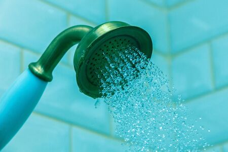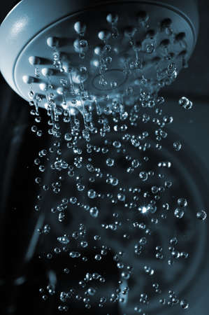 sprinkling water from shower head, closeup, blue toned photo.
