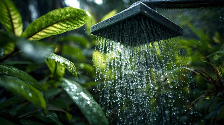 This image captures a showerhead pouring water in a vibrant tropical setting, surrounded by lush greenery. It evokes feelings of relaxation and rejuvenation.