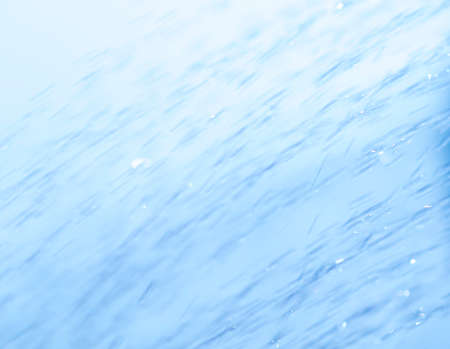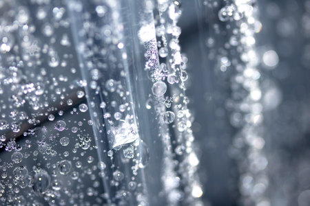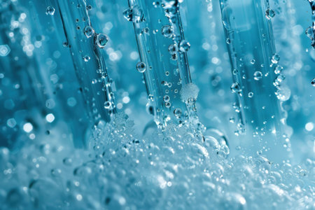 Water flows through a clear surface, creating numerous bubbles and droplets. Light reflects off the water, making the scene appear bright and dynamic in its movement.