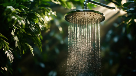 A serene shower head drips water amidst lush green foliage, creating a refreshing atmosphere. Perfect for promoting relaxation and wellness in nature.