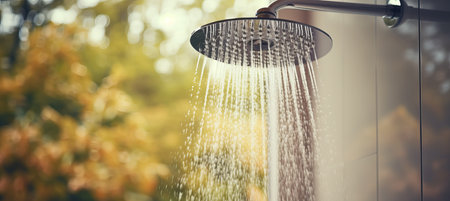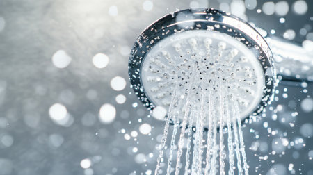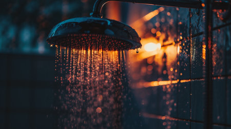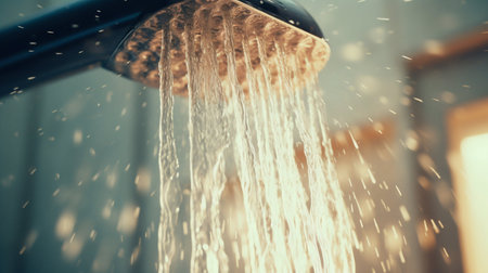 A captivating close-up of a showerhead releasing water droplets, illuminated by soft sunlight, creating a serene and refreshing bathroom atmosphere. Perfect for wellness themes.