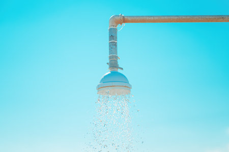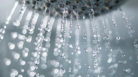A shower head with water droplets falling from it. The water droplets are clear and shiny, creating a sense of freshness and cleanliness. The image conveys a feeling of relaxation and rejuvenation