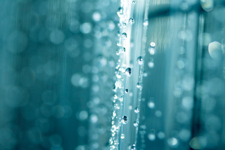 Macro detail of falling water drops reflecting light in a modern luxury shower