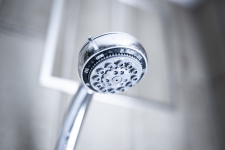 Shower head with refreshing water droplets spraying down in modern bathroom