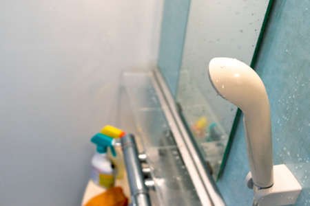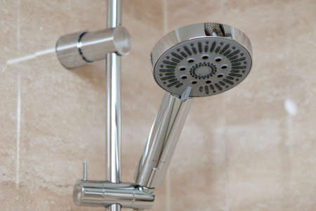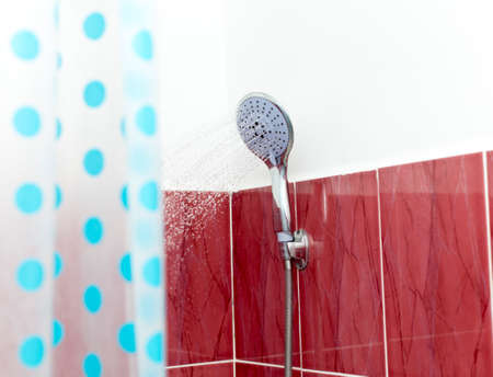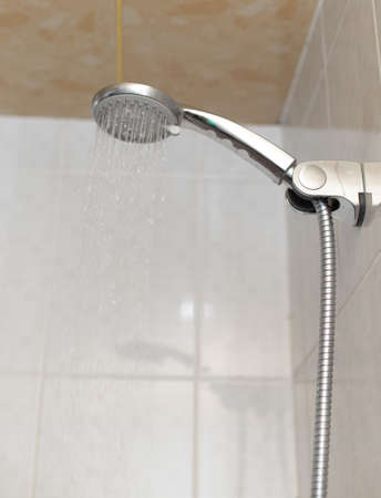 Showerhead in bathroom. Shower head with blurred hot water drops. Take a fresh contrast shower for sweat wash off