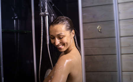 Portrait of smiling nude young woman enjoying flowing water, taking shower, standing in bathroom, holding hands on shoulder taking care on her skin on gray black backdrop of wooden house