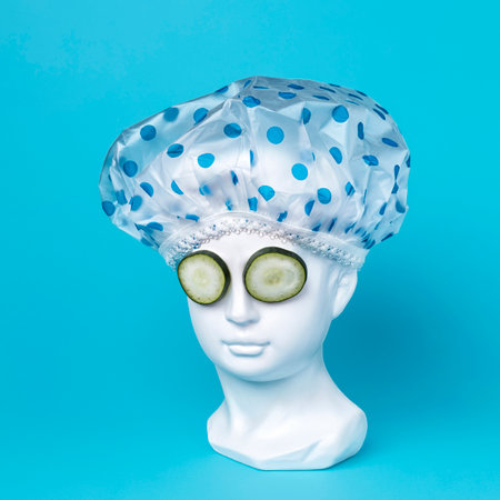 Cucumber eye treatment and face mask with white head statue on blue background. Minimal modern beauty salon concept.