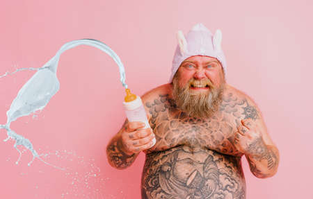 Funny man with wig act like a baby and is angry