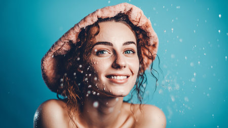 young woman wrapped in blue towel with shower cap smiling gently, wooden background, natural light, relaxed and fresh after bath or spa