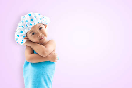 Portrait beautiful Asian child girl wearing a pink towel and shower cap, 6-8 years old, positive emotion, showing mini hearts, smiling face, looking at the camera, white wall, studio shot.