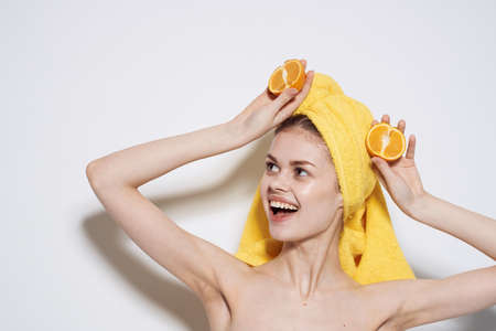 Pretty woman orange in hands naked shoulders natural cosmetics cropped views