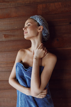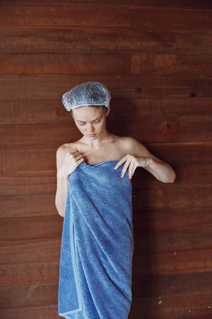 young woman with shower cap wrapped in blue towel standing in wooden sauna, calm facial expression, natural light, warm toned cozy atmosphere