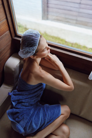 young woman wrapped in blue towel with shower cap sitting by wooden wall inside spa room with natural window light, relaxed and calm expression