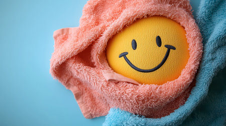 A bright yellow smiley face is nestled between fluffy pink and blue towels, creating a cheerful and inviting atmosphere.