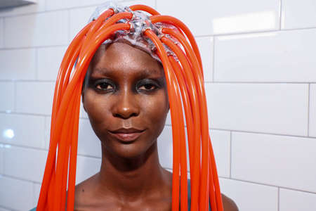 Drag queen person getting ready after shower in front of the bathroom mirror.