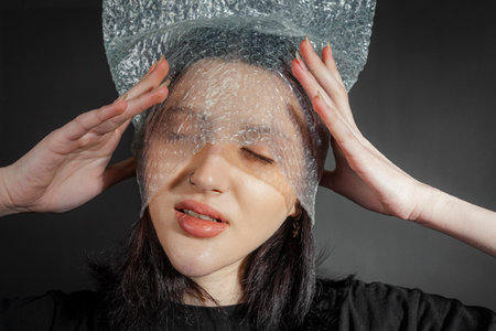 Conceptual artistic portrait of a woman wrapped in plastic film, expressing emotions of confinement and vulnerability, minimalistic background.