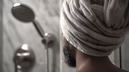 woman in shower cap wrapped in towel standing in modern bathroom facing mirror, skincare routine, personal care, wellness, calm atmosphere
