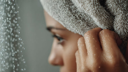 Close-up of a woman with a towel on her head after taking a shower. Focus on hand and face.