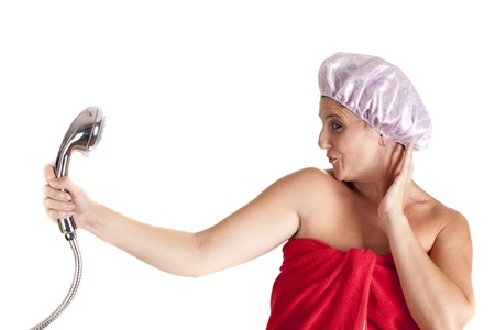 Woman in shower cap and towel screaming