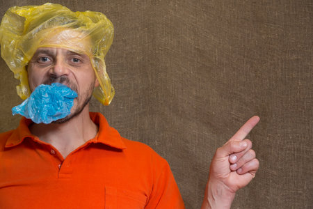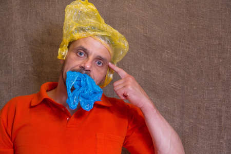 The man holds a plastic bag in his mouth. A man has a plastic bag on his head. Nature plastic pollution concept.