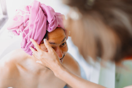Happy childish funny asian man being take care of showering by his wife.