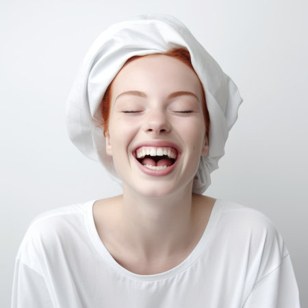 woman laughing with a white towel on a white background. this stock photo captures a whimsical minimalism style, showcasing a unique and one-of-a-kind piece by the contest winner, brandon woelfel. the uhd image highlights the monochromatic portraits and the realistic portrait painter's talent. ai generated