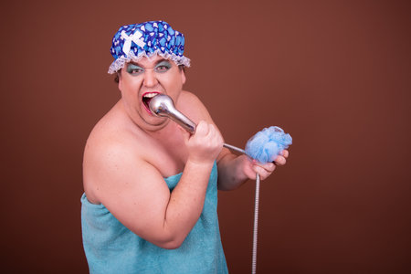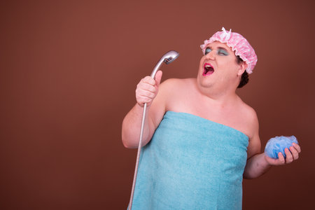 Funny fat man in blue cap sing in the shower. Fun and cleanliness