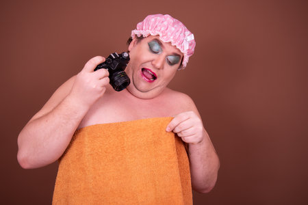 Portrait of overweight man wearing shower cap against brown backgroun