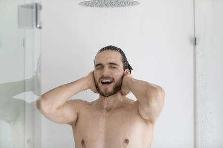 Man showering in bathroom. Man taking morning shower. Washing hair under water drops from shower head. Closeup guy showering. Body care hygiene. Shower concept. Man under water drops in shower.