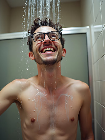 A young man with a beard smiles joyfully while surrounded by soap bubbles in a modern shower, capturing a moment of relaxation and cleanliness.