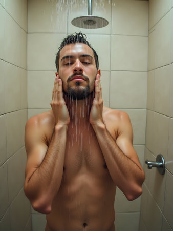 A close-up shot of a man enjoying a shower, with water droplets sparkling on his face and beard. The image captures a moment of relaxation and refreshment, highlighting the beauty of self-care.
